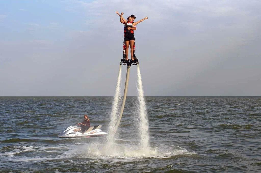 Когда научился гонять на вейкборде , вейксерфе, пора попробовать ФЛАЙБОРД! Флайборд представляет собой доску с креплениями, которая соединена специальным шлангом с двигателем гидроцикла. Гидроцикл Yamaha FZS, 250 л.с. Научиться летать на флайборде легко и просто. Никакой специальной подготовки для флайбординга не требуется. Инструктаж займет не более 20 минут и вы сможете легко балансировать над водой на высоте 3-4 м, используя водные ботинки. Обучение происходит быстро, на интуитивном уровне — тело без труда понимает, что нужно делать. В программу входит: -Инструктаж и подбор гидрокостюма (в прохладное время года) -Гидрокостюмы бесплатно! - Погружение в воду с доской и пробные катания -Катание Важно! Всем взрослым иметь при себе паспорт (ксерокс или фото в телефоне или возможность зайти на Госуслуги). Цена: 7500 за 20 минут чистого полета. Отправление ежедневно, без перерывов и выходных, по предварительной записи.
