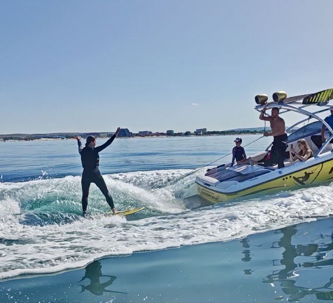 Любишь увлекательно проводить время, чтобы остались воспоминания на целый год? Тогда тебе на вейкбординг! Вейкборд – это доска с креплениями в виде ботинок. С помощью фала (специального каната) райдер держится на воде и идет за катером по водной глади. Специальной физической подготовки не требуется! На доску встают даже дети))). За штурвалом находится тренер- пилот, который проинструктирует вас и поможет понять весь процесс. Адреналин и хорошее настроение гарантированы! В программу входит: -Инструктаж и подбор гидрокостюма (в прохладное время года) -Гидрокостюмы бесплатно! - Погружение в воду с доской и пробные катания -Катание Важно! Всем взрослым иметь при себе паспорт (ксерокс или фото в телефоне или возможность зайти на Госуслуги). На выбор можем предложить вам: - вейкбординг за катером Джокер - 6000/час: Максимум 5 пассажиров на борту, чтобы было удобно работать тренеру с райдером. За час успеет покататься 2-3 человека ( зависит от степени подготовки). Другие гости могут снимать и также поддерживать своих друзей. -вейкбординг за спортивным-буксировщиком Мумба : максимум 8 пассажиров - 7000/час. Отправление ежедневно, без перерывов и выходных, по предварительной записи.